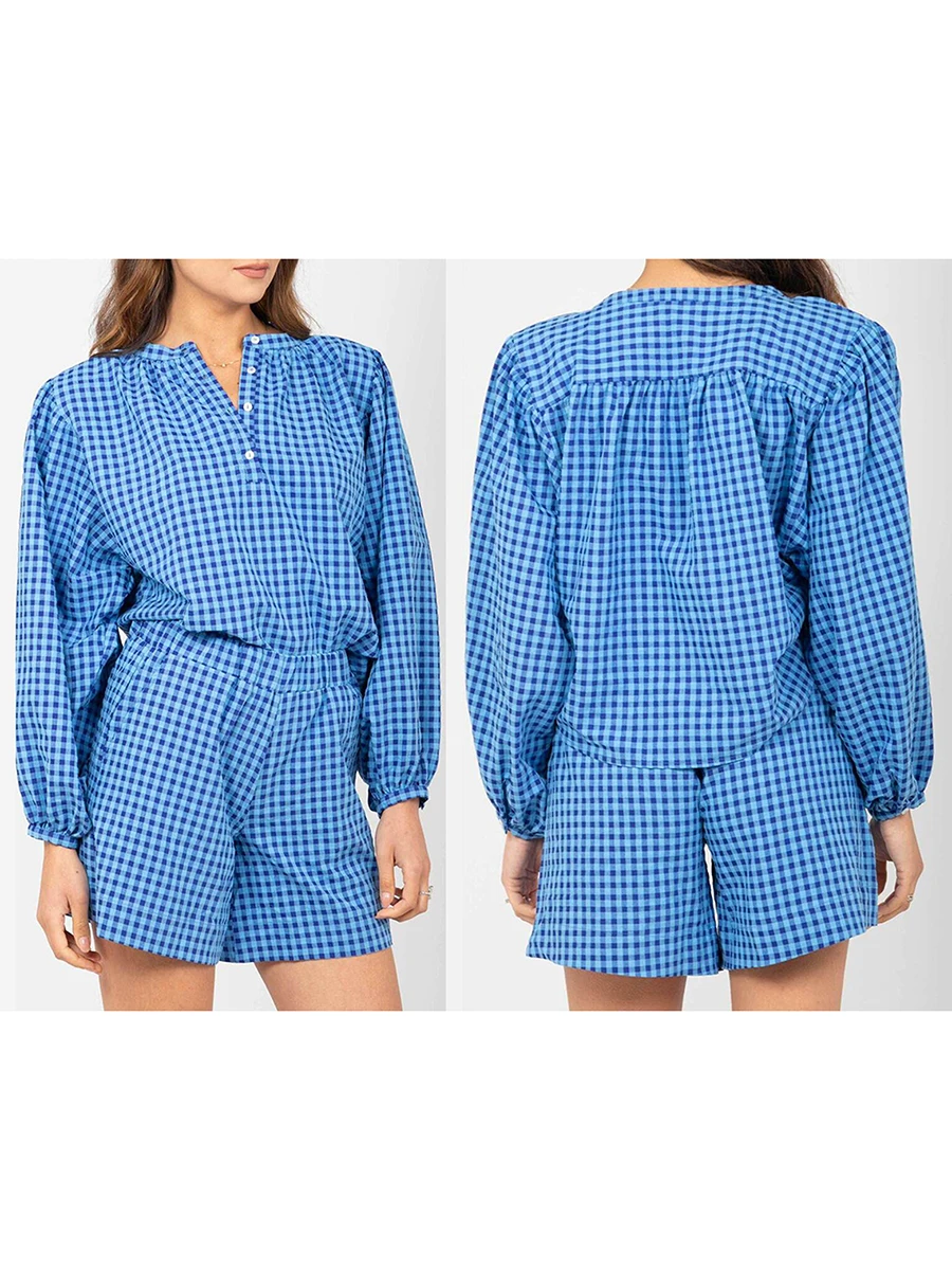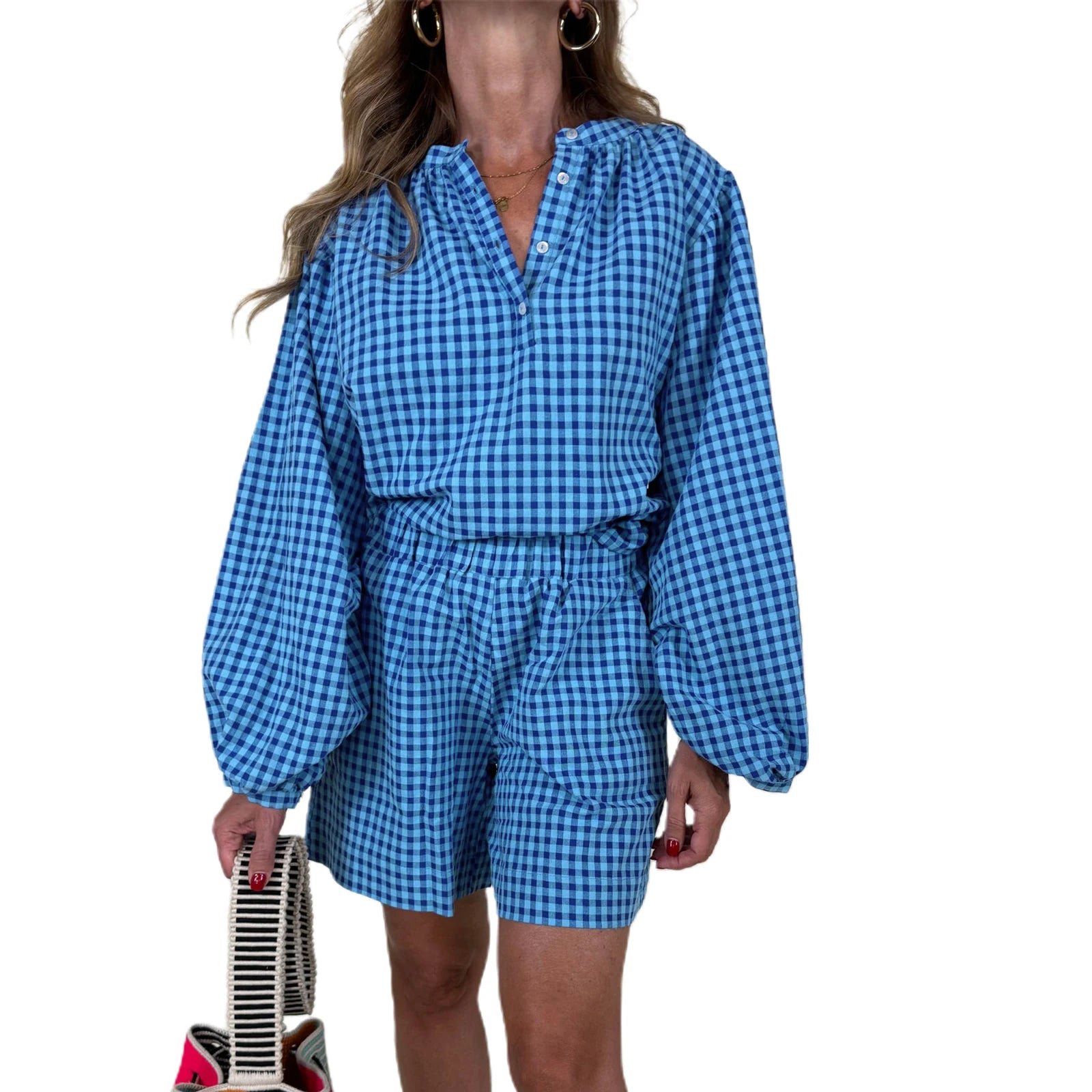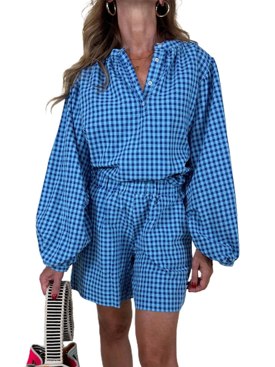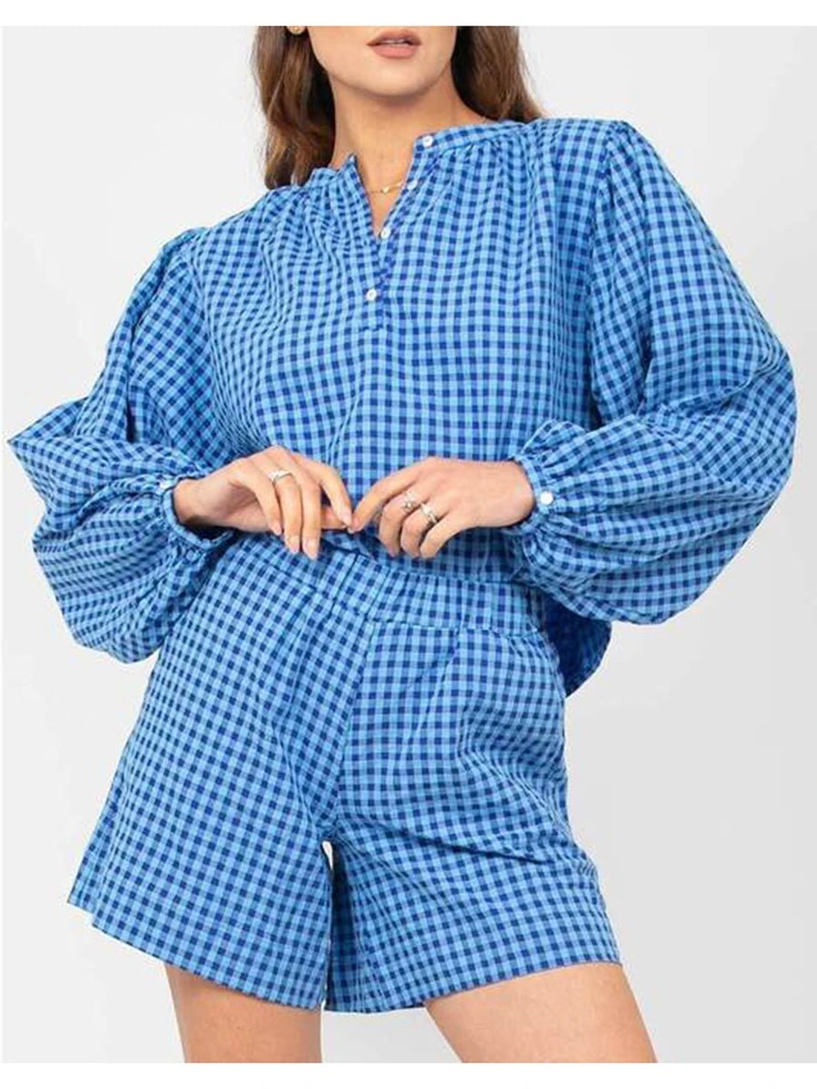 Women Pajamas Set 2 Pieces Loungewear Suits Plaid Buttons Long Sleeve Loose Tops and Shorts Sleepwear Outfits