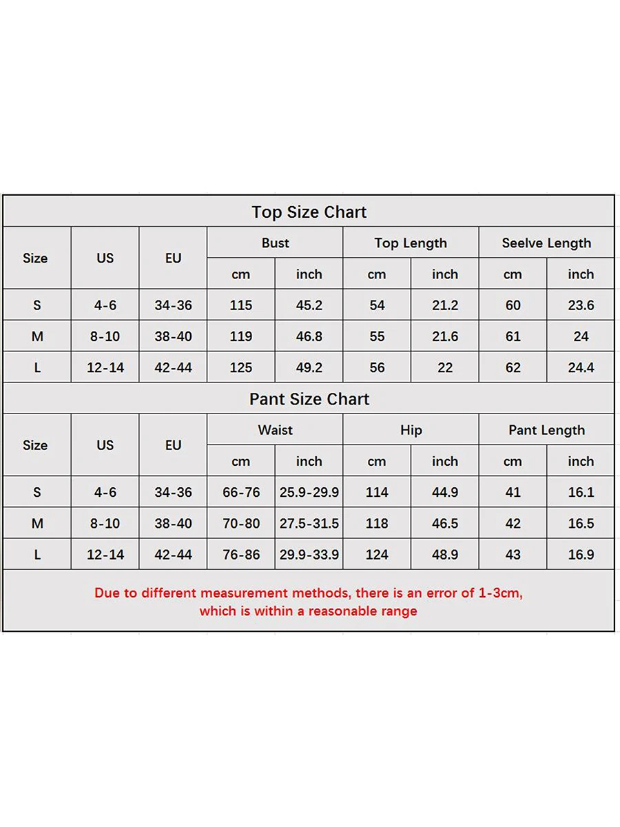 L Tops Length: 22.05 Bust: 49.21 Sleeve: 24.41 Pants Length: 16.93 Waist: 29.92-33.86 Hip: 48.82