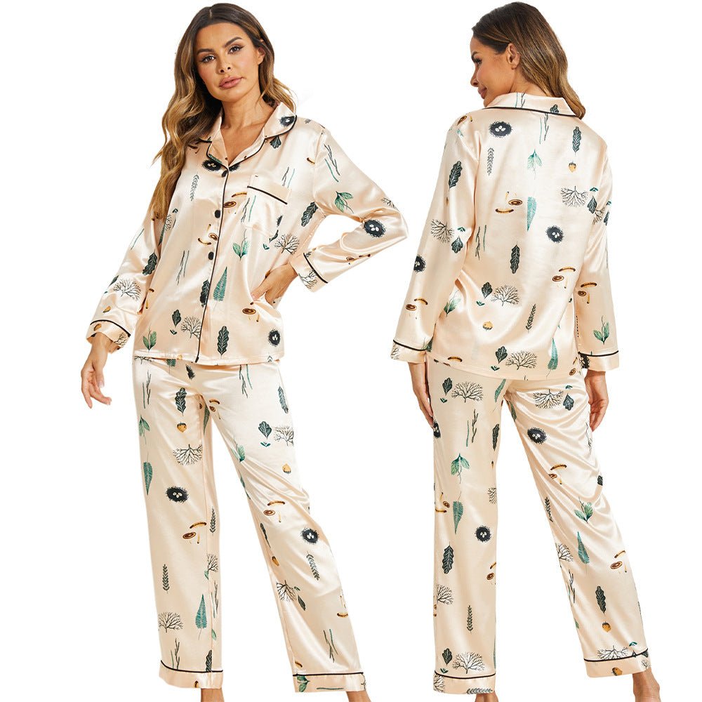 SatinDreams: Silk satin printed pajama set for luxurious women’s home comfort.